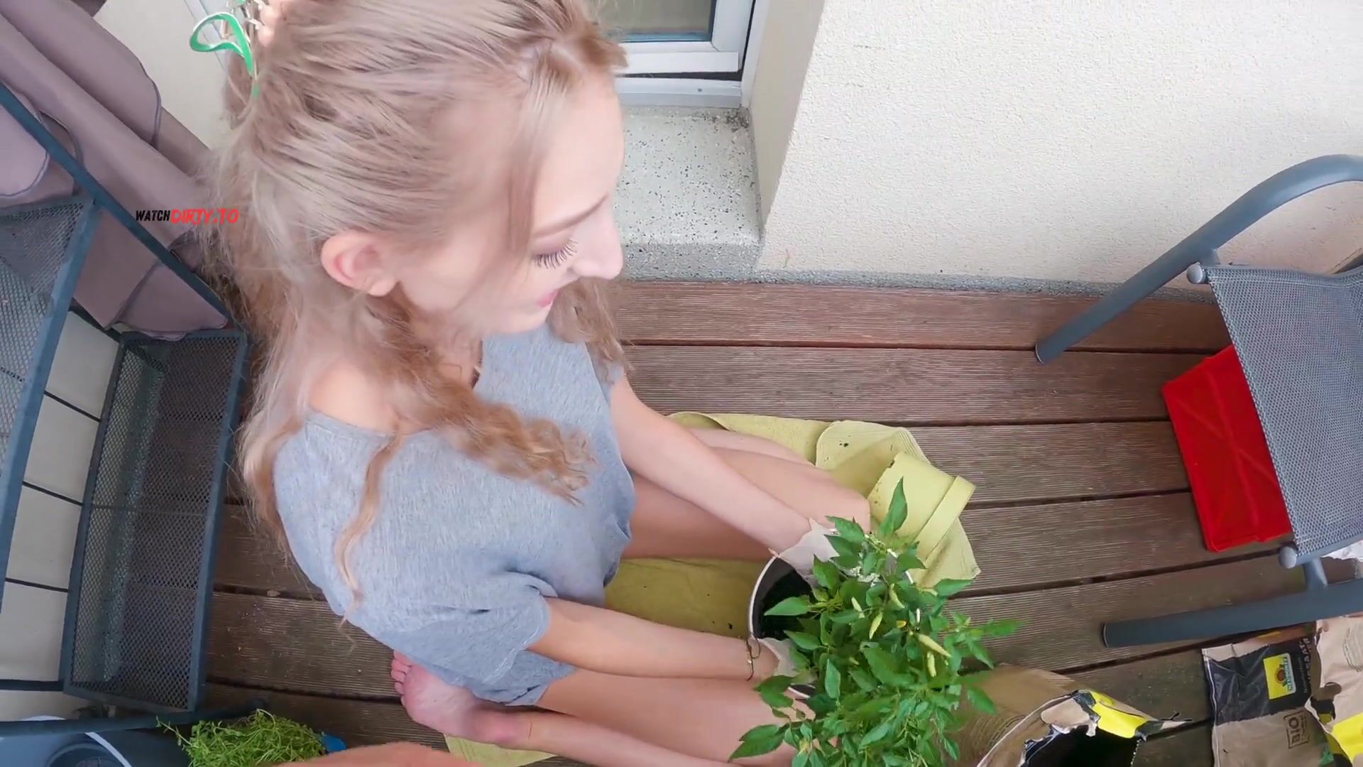 Ich brauche unbedingt wieder Kräuter für meinen Balkon. Wir sind also direkt los um welche zu kaufen. Ich liebe Pflanzen und freu mich schon total aufs Umtopfen :D Hab mir extra noch Handschuhe mitgenommen, da es wirklich viel dreck machen kann. Als wir bei mir waren, wollte ich gleich auf den Balkon. Gerade begonnen stelle ich schnell fest, dass wieder was in der Luft schwebt… Durch mein tshirt schimmert mein BH etwas durch. Naja reicht wieder mal, um auf einen schmutzigen Gedanken zu kommen hihi :D Aber wir sind doch auf dem Balkon? Hm bisschen schiss hab ich schon, dass es zu laut sein könnte für die Nachbarn… Ich bemühe mich total leise zu sein! Manchmal flutscht mir aber doch ein lautes Stöhnen raus hihi :D Diese Stellungen mhh… Ich merke, wie mich ein mega Orgasmus überrollt! Total geil! Zum Schluss, gibt es eine riesige Ladung in mein Gesicht! Das ist so viel, dass ich kaum klar gekommen bin :D